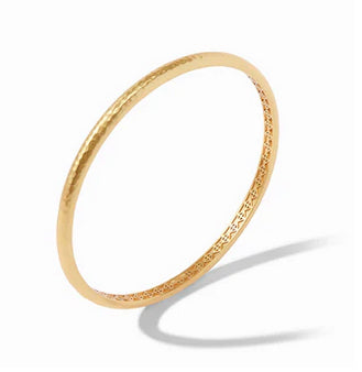 Elegant yet simple, this slim golden bangle features a lightly hand-hammered finish. An ornately geometric bas relief interior adds lightness and luxury for wearing stacked or solo.