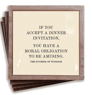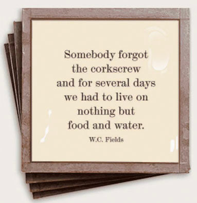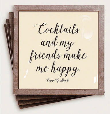 Handcrafted of glass and antiqued copper with plastic bumpers to protect the tabletop, effortlessly entertain your guests with charm. Classic typeset is composed on natural background and the set of 4 is wrapped with pewter grosgrain ribbon.