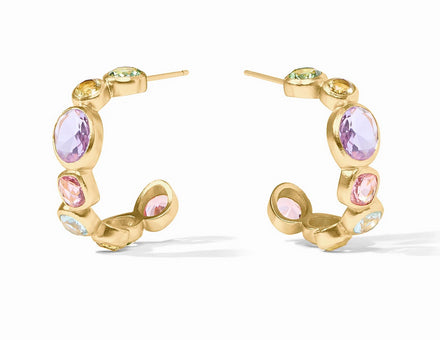 Like a meandering secret garden path, these hoops' flawlessly sparkling gold-set gemstones in varying sizes, shapes, and tones dance together in the sunlight.