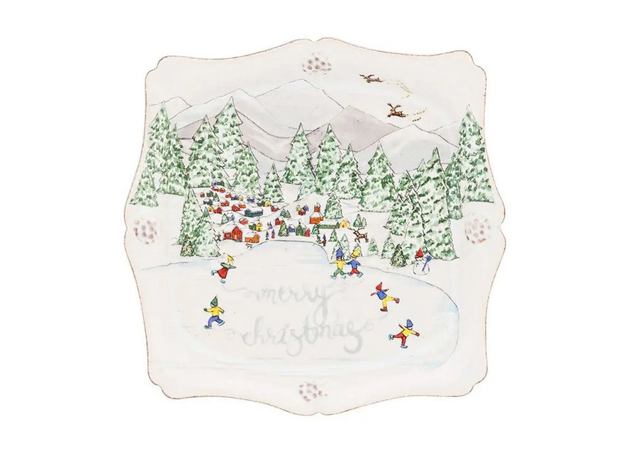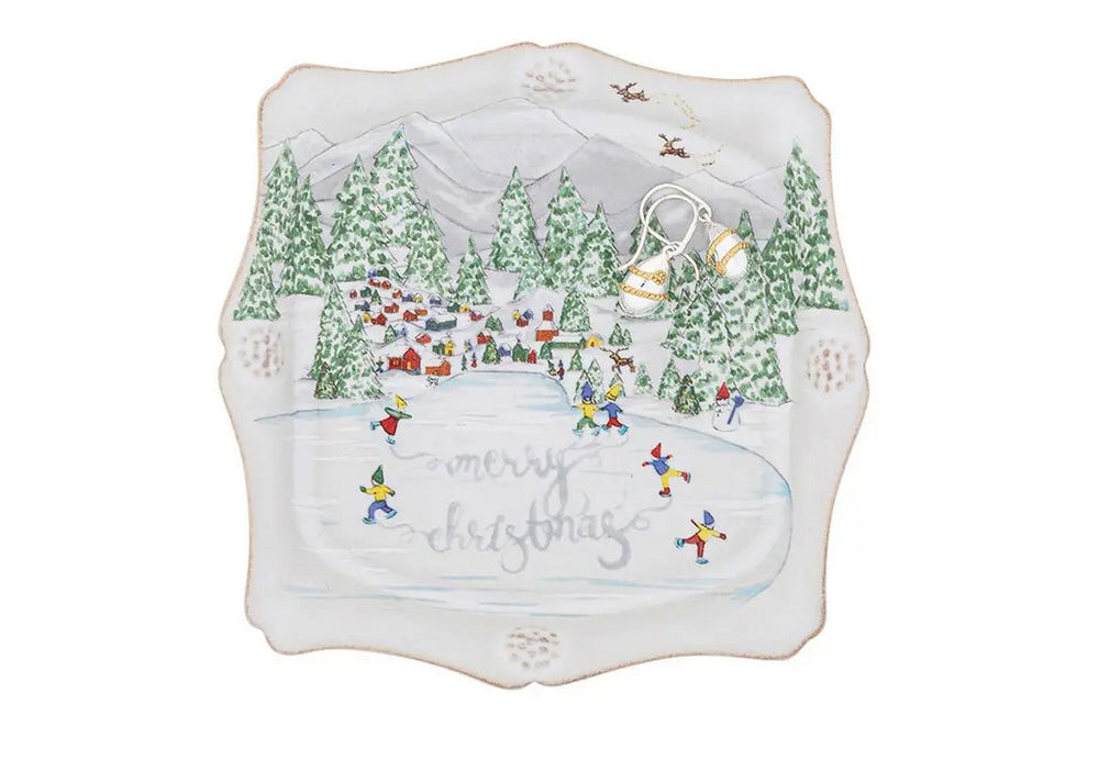 The mythical, folkloric world of the North Pole is hand illustrated atop Juliska's iconic Berry & Thread scalloped shape. Enjoy the whimsical depiction of an alpine village, with colorful ice skaters dotting the Nordic landscape.