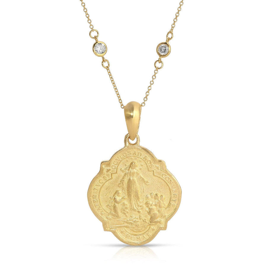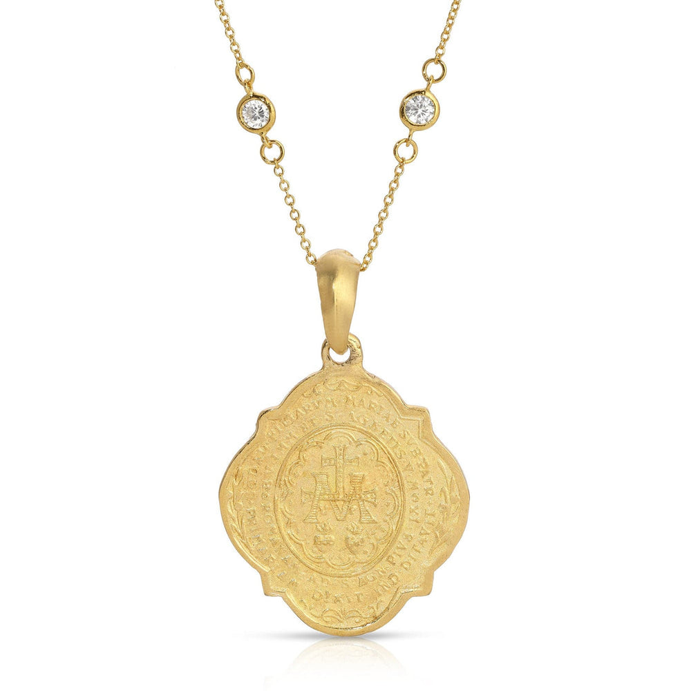 A beautiful apparition of Mother Mary, this intricately detailed double-sided 14k gold plated brass pendant is a stunning tribute to the mother of Christ. The front side features a portrait of the Virgin Mary and the reverse the Miraculous Medal with a Cross and the letter M symbolizing the close relationship of Mary to the suffering, passion, and death of her Son. The pendant is reversible, so you can keep either side close to your heart.