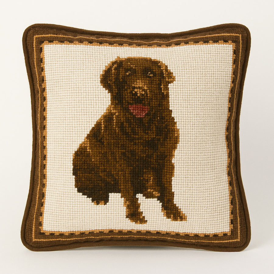 One pillow showcases a chocolate Labrador Retriever, seated sweetly with a friendly expression.