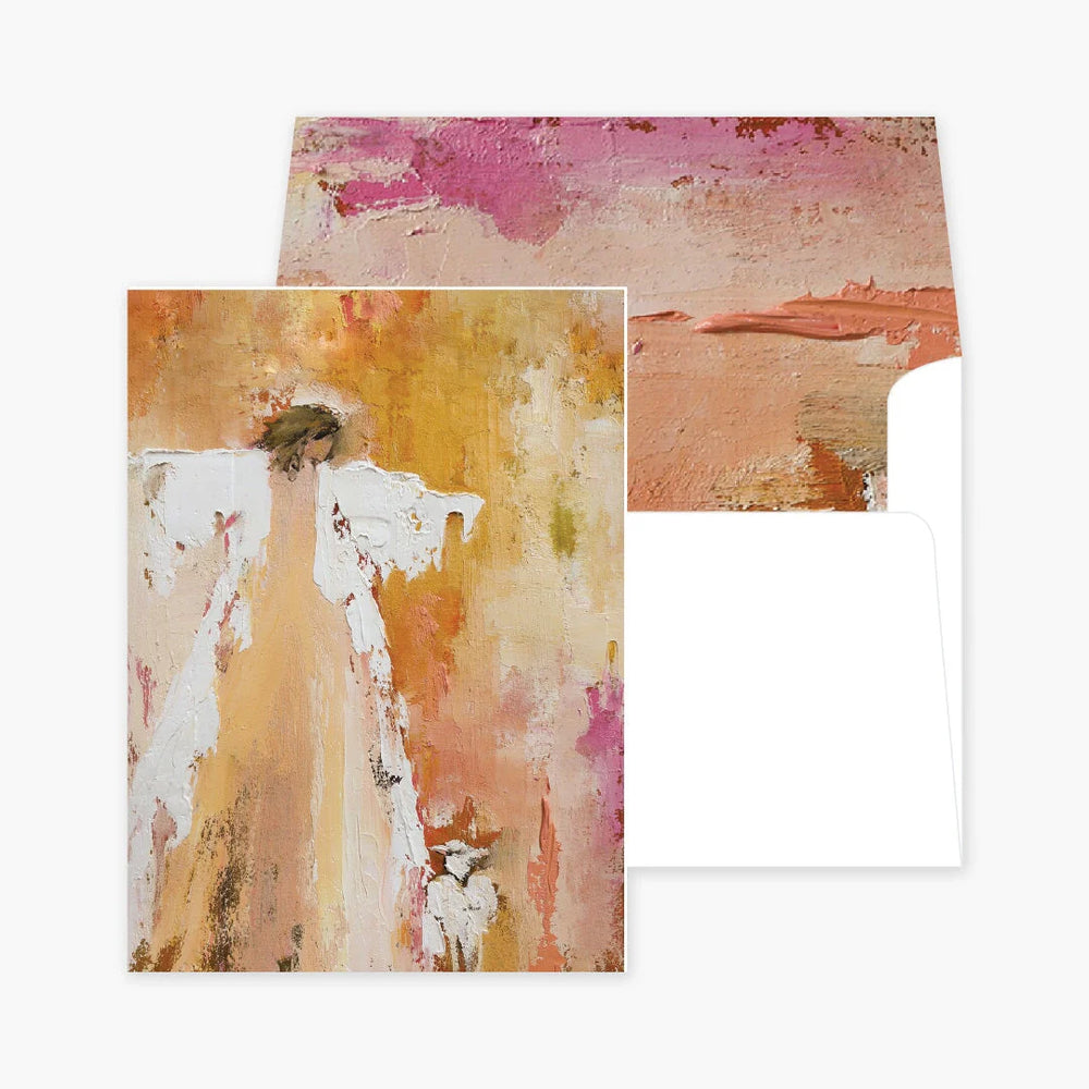 Everyone loves a handwritten note and our beautiful fine art notecards are a blank canvas for your words. Whether you are sending a note of congratulations, encouragement or sympathy, our notecards share your thoughts with beauty and flair. Our Joy Notecards feature the same angel throughout each pack and they also include a beautiful coordinating lined envelope. There are a total of 14 notecards and envelopes included in each pack. Notecards are a 3.75 x 4.25 inch vertical fold over card, blank inside.