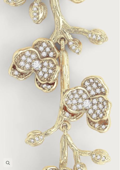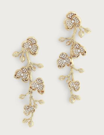 Featuring 18k gold dipped brass accented with hand set crystals, the sculpts of the earrings are as delicate as they are intricate. The stems each have multiple hinges, allowing the crystal pavé flowers in clear white crystal, to swing and catch the light beautifully.