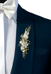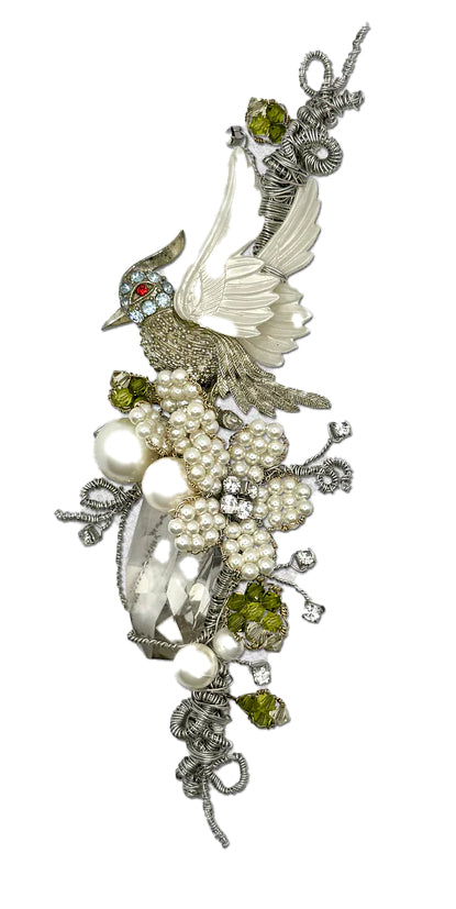 The Pearl Garden and Blue Jay lapel pin. This beautiful scene is of a young jeweled blue jay enjoying the pearl garden. Accented by crystal leaves, floating rhinestones, pearls and anchored by a clear crystal drop. All finished with 14kt gold-filled wires.