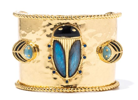 Exotic, regal and refined our stunning Scarab is an empowering talisman of resilience. Rendered with luminescent hand carved blue labradorite shell polished into noble wings, a black onyx is set for the head and tiny feet sit rest purposefully atop an Flash gold plated brass cuff. The accompanying pair of Lovebugs are the catalyst and nourishment to the ongoing quest for re-newel.