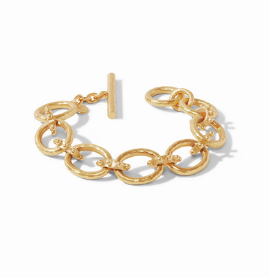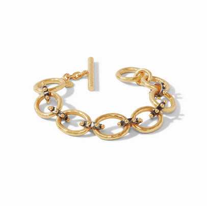 Studded connecting links mingle with lightly hammered ovals to create a piece that balances edge and elegance to stunning effect.