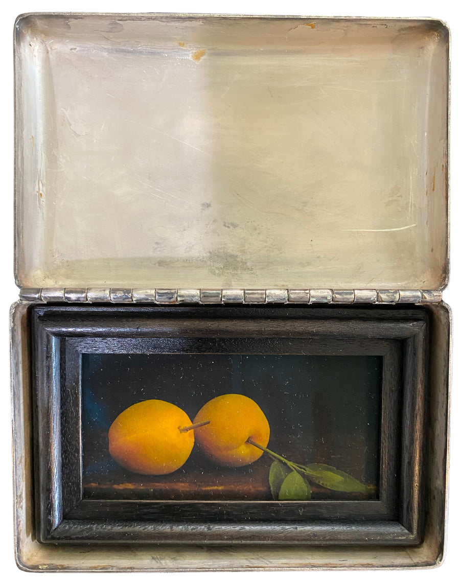 An intimate and imaginative work by acclaimed New York artist Jefferson Hayman, The Apricot Fields is a one-of-a-kind photograph presented inside a vintage silverplate box. A master of composition and mood, Hayman captures the quiet poetry of two apricots resting on a darkened tabletop, framed in a hand-carved black frame and nestled inside the repurposed keepsake box.