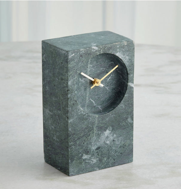The marble tower clock is crafted from natural marble with simplistic brass clock hands and a brass back plate. Perfect in size, place on any bookshelf, desk or nightstand for style and function. Offered in white, or green colorways. As marble is a natural product, please be aware that there will be variations in veining and color.