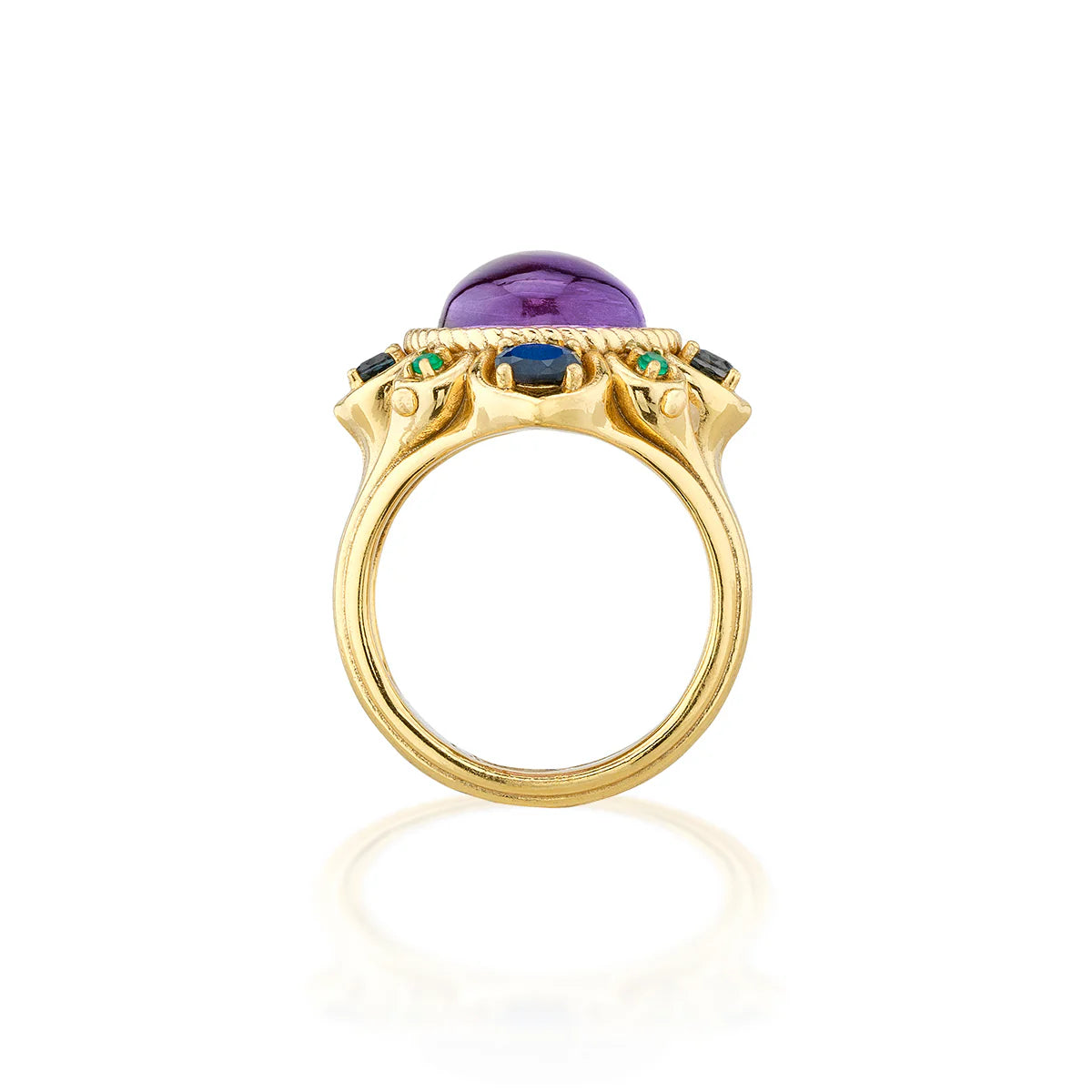 We cannot confirm whether or not this luminous amethyst gemstone possesses magical powers (or if it's just you) but marvelous things tend to happen when it's worn. Exquisitely detailed with a golden braided trim and romantic Byzantine silhouettes bejeweled with green onyx and London blue topaz—this statement ring is colorful, regal and whimsical. Wear it to pen a novel by candlelight or dance under the stars.