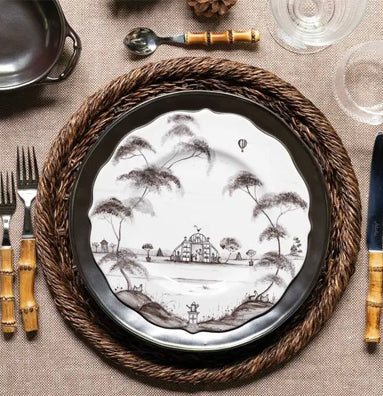 Tightly hand-woven rustic fibers create a rustically handsome charger that makes a quiet statement.