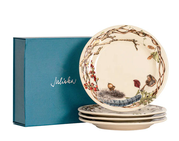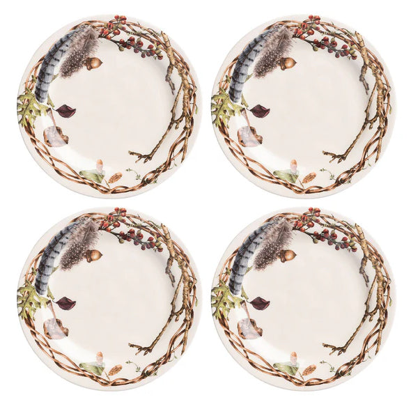 From the Forest Walk Collection- Rustic organic elements like twigs and acorns, festoon the borders of these plates in a rich color palette of gorgeously tangled elegance - creating an irresistible display for nibbles, tidbits, and gourmet pleasures. Gift boxed.