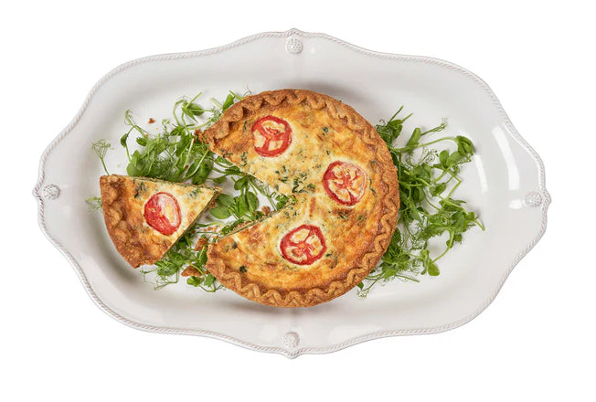 From the Berry & Thread Collection - Rimmed with a simple thread and adorned with a sprinkling of berries, this iconic dinnerware collection embraces the historic motifs of Juliska's Bohemian glassware. Ideal for a large gathering, this 20" platter with a subtly scalloped edge will take your roast straight from oven to table. The 16 in platter, with a subtly scalloped edge is perfect for serving a few, or a feast and goes seamlessly from oven to table.