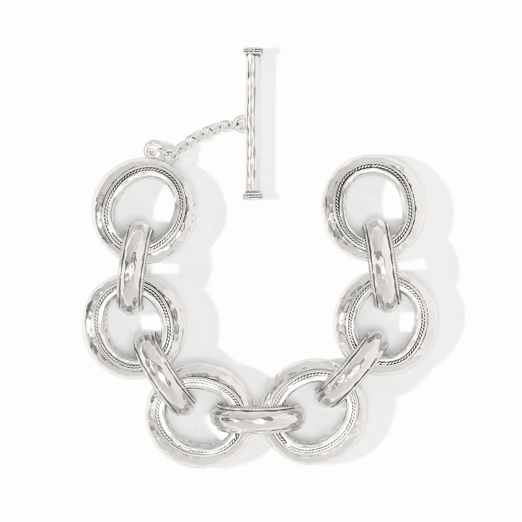 An elegant bracelet of lightly hammered golden links featuring a splendid pierced design on the inside and finished with a toggle.
