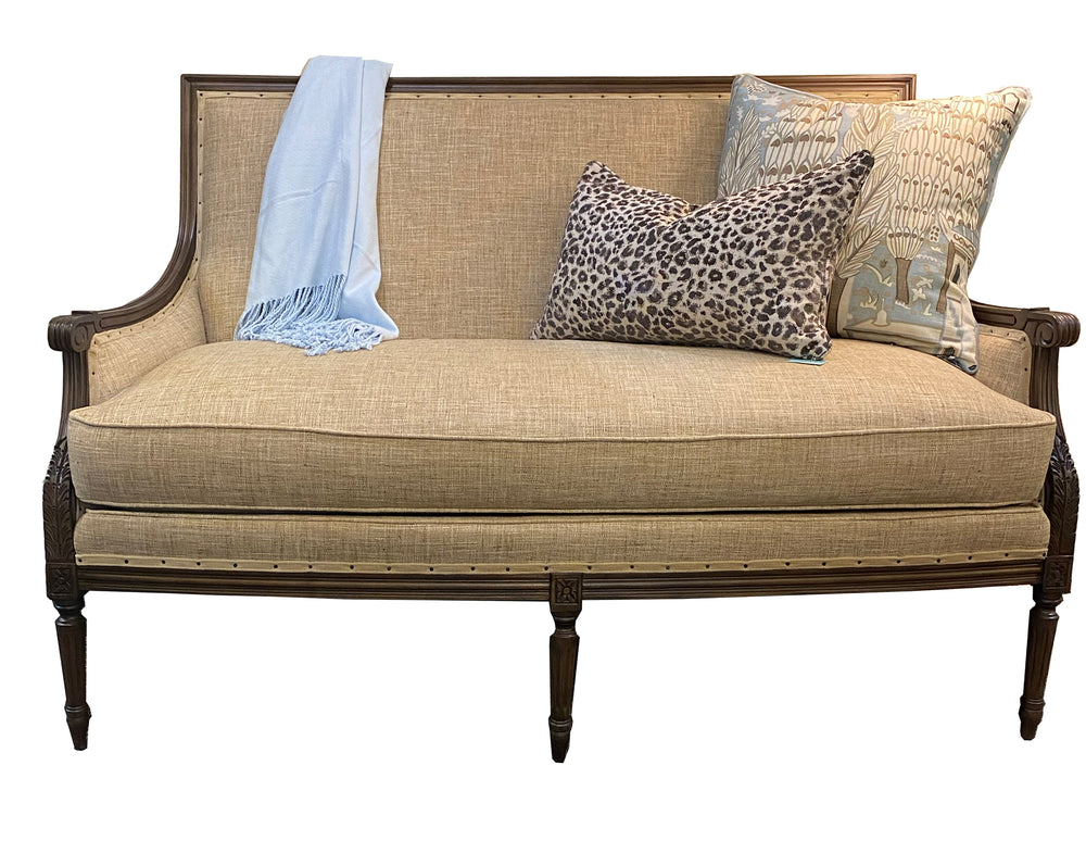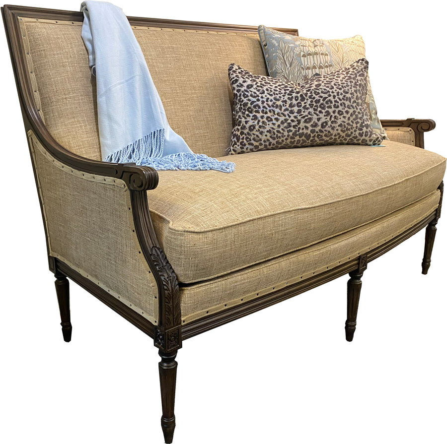 This exquisite Wesley Hall settee brings timeless elegance to any interior with its finely carved wood frame, classic proportions, and tailored silhouette.