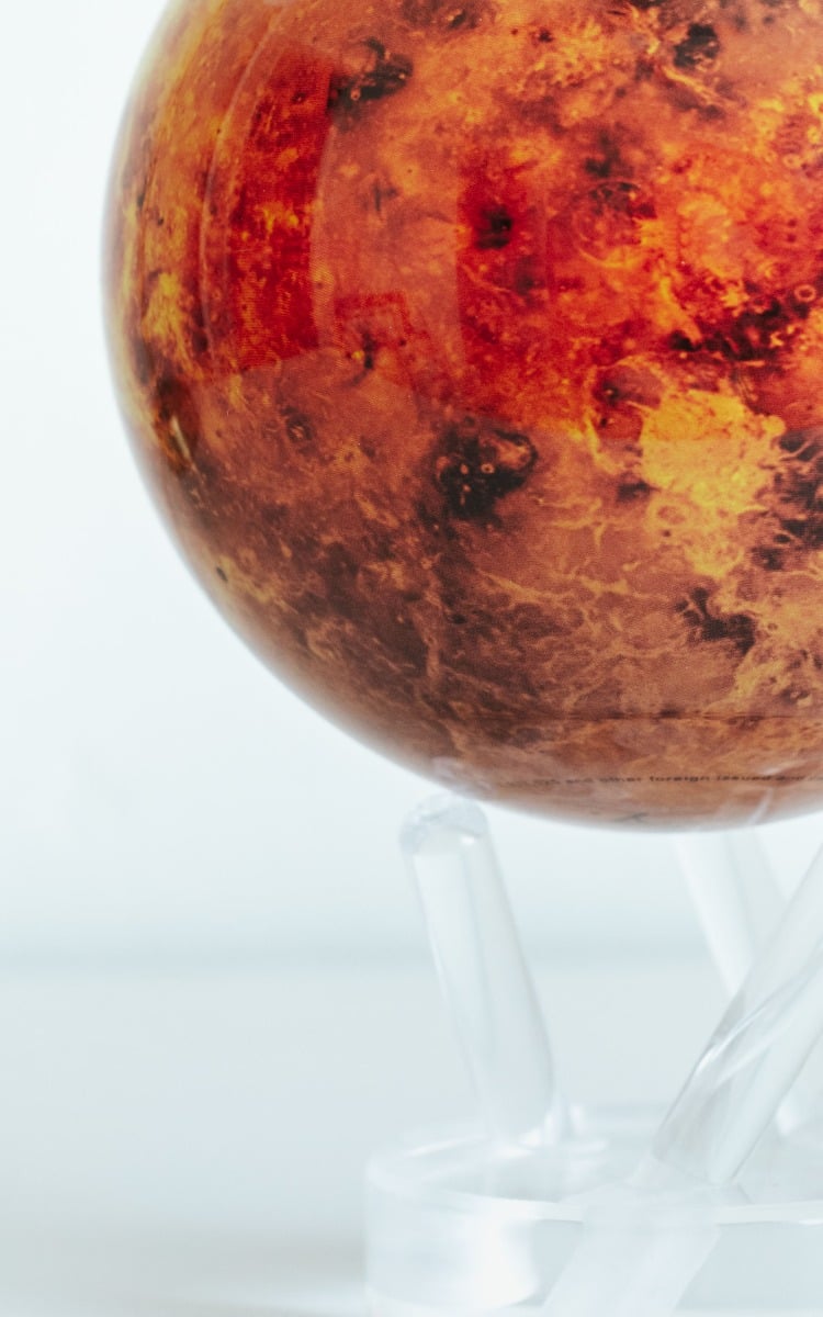 Venus is the second brightest object in the solar system and, for this reason, is often called the 'Morning Star'. Named for the goddess of love in Roman mythology, Venus boasts a bold color palette, full of flaming red and orange hues–colors of passion and beauty. It is said that the Romans named the planet after one of their most prominent gods because it was the brightest of all the planets. We've captured Venus' natural allure and scaled it down to create this beautiful desktop Venus replica.