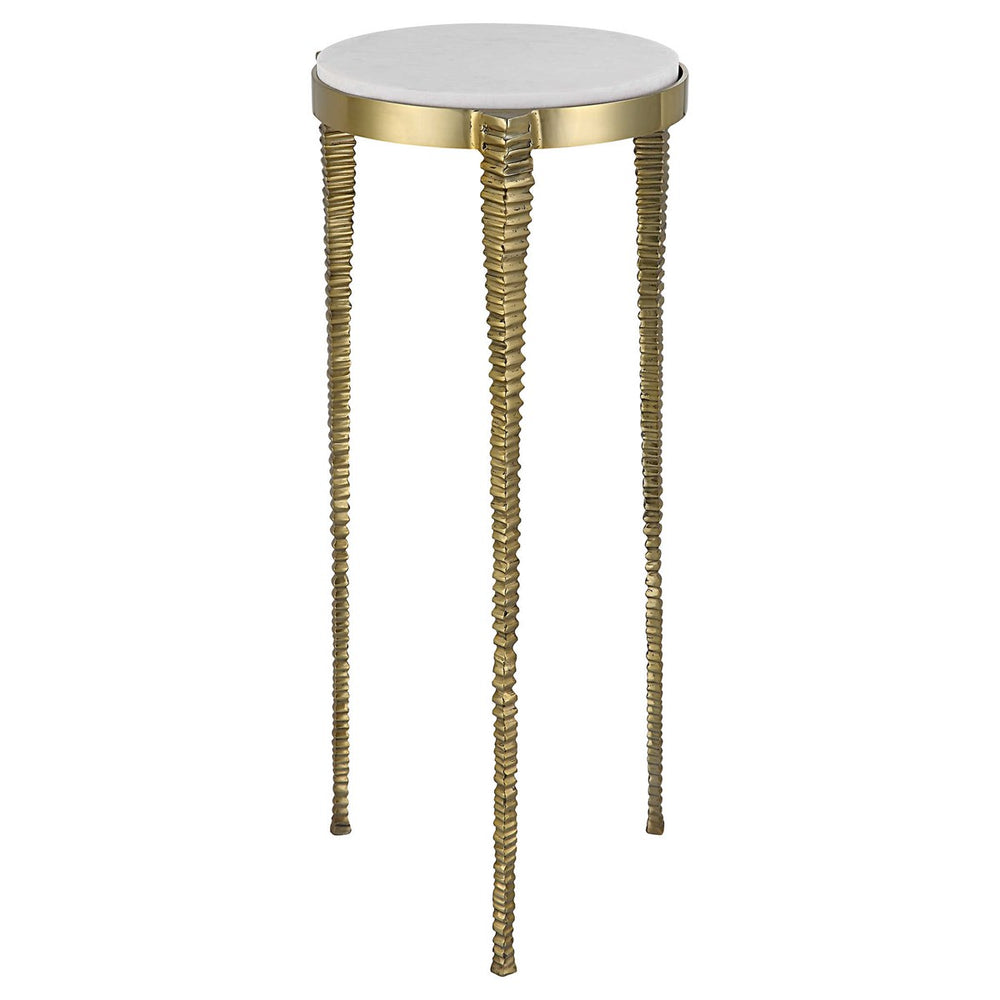 The perfect spot to place your favorite cocktail, the Aperitif drink table features an inset natural honed white marble top with dramatic tapered legs in solid cast iron with a rich brushed gold finish.