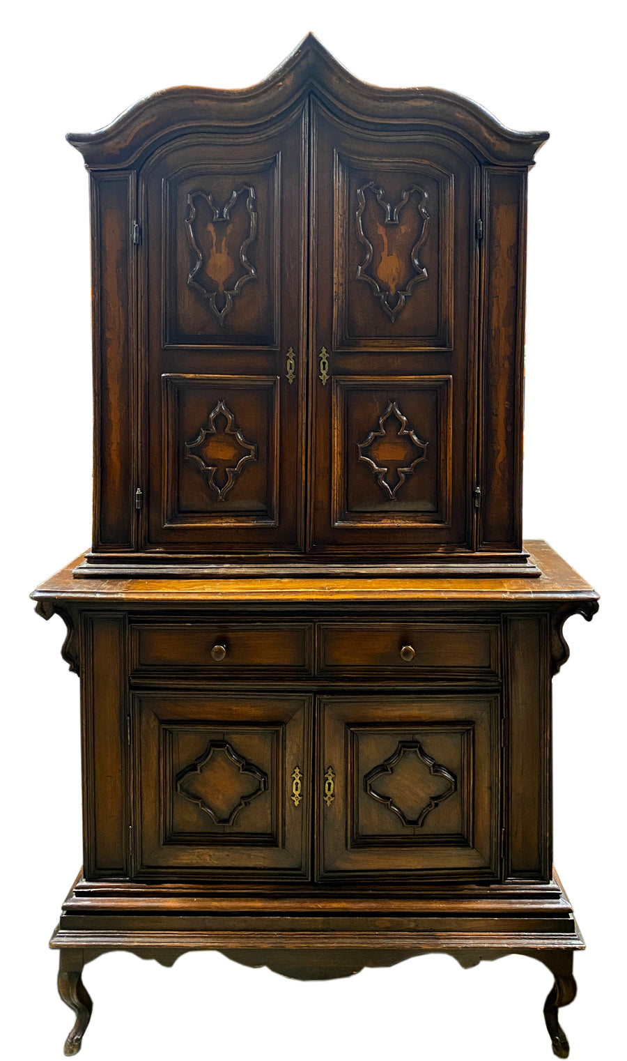 Antique English hutch with a fine aged patina, soft timeworn hand and fantastic form. A nicely patinated piece with inlay details. The hutch sits on top of two drawers over double cabinet doors with brass teardrop pulls. A fantastic narrow size for any space!