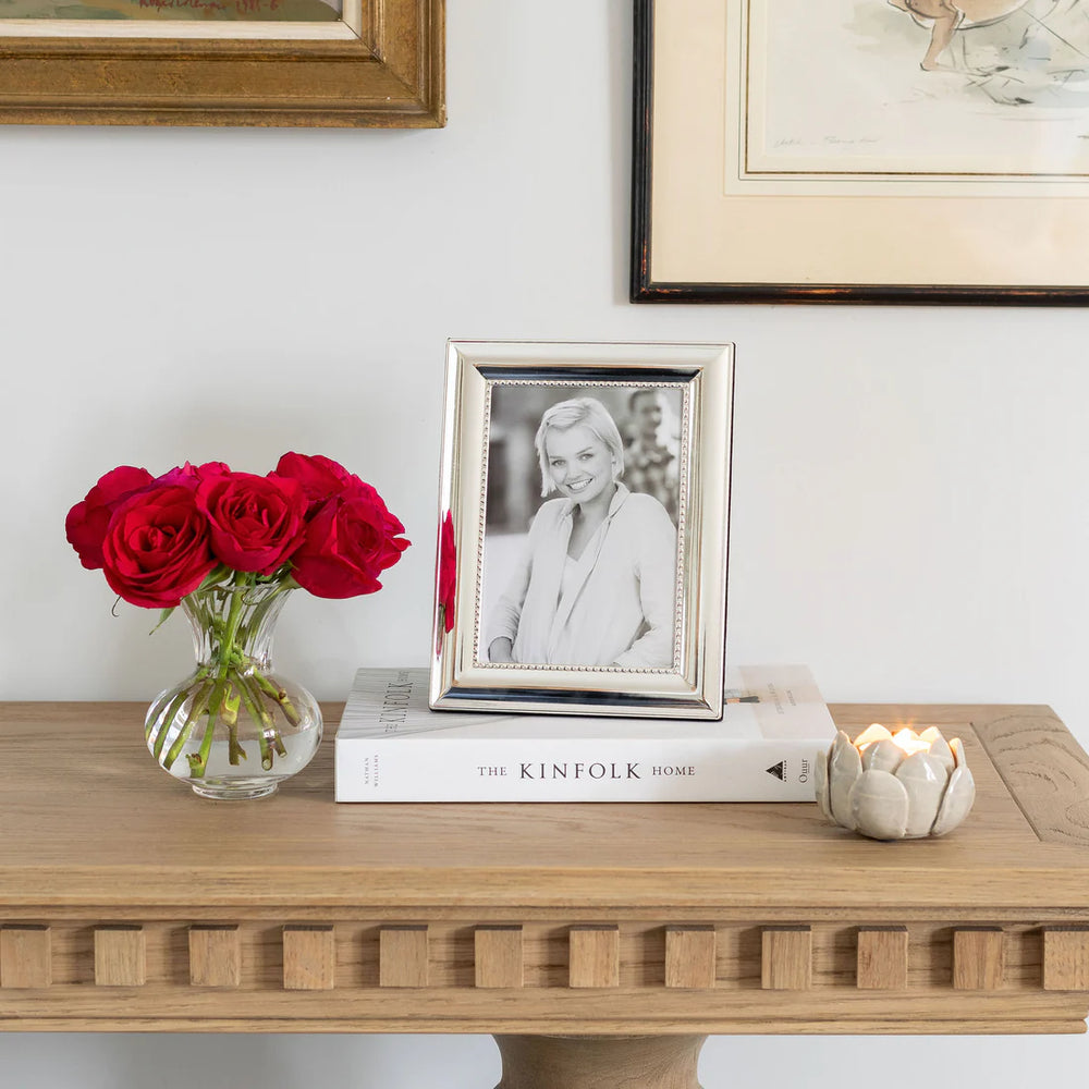 This splendid silver frame with beaded edging is a fresh approach to a traditional elegant silver profile. An exquisite wedding or anniversary gift.