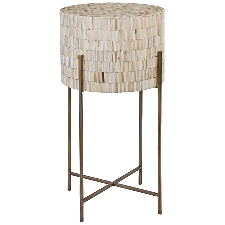 All the elements of this unique table come together perfectly: the intricately inlaid bone, the soft shape, and antiqued brass legs blend old-world style with a modern, mixed material sensibility. Use it to round out a contemporary arrangement in a sophisticated style or to accent a modern ensemble.