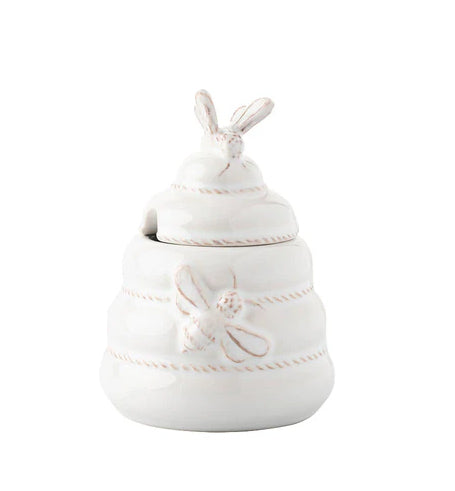 From breakfast to tea time, this beautifully sculpted ceramic hive gives a home to your favorite honey - with a lid and wooden spoon for serving.