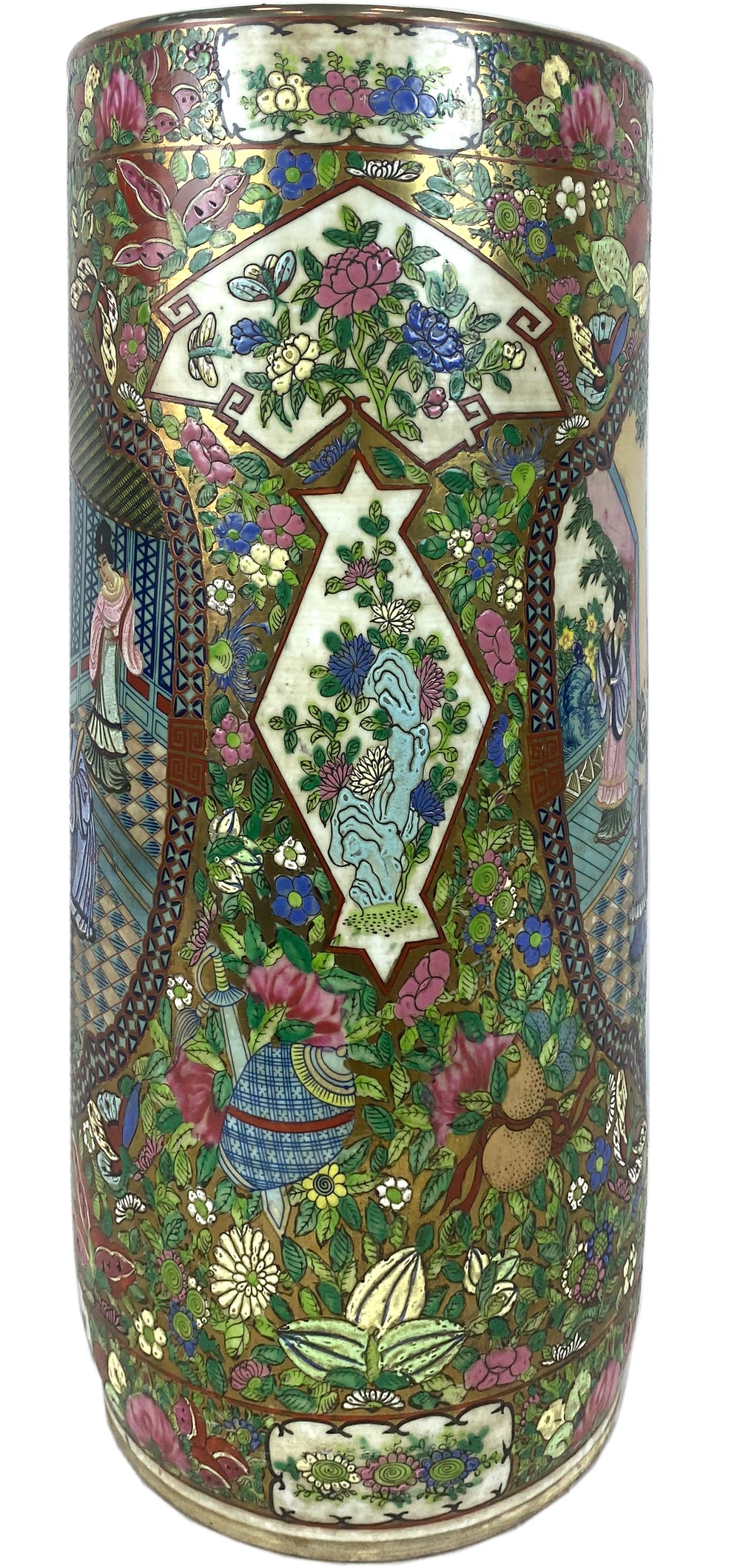 This is a large vintage Famille Rose stick stand. A Chinese ceramic hall stand circa 1940. White ceramic ground finished with court scenes and foliate patterns. Appealing color palette hosts pinks, oranges and greens. Rolled rim decorated with a quartet of vine leaf garlands. Classical court scenes within colorful panels to the front and rear. Famille rose background patterns with gilt accents add distinction. Ideal for the entrance hall.