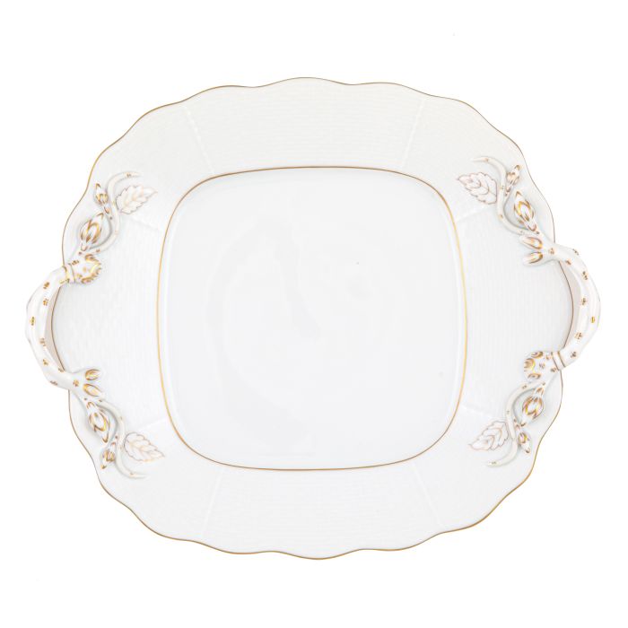 Delightfully refined and perfectly portioned, the Herend Golden Edge Square Cake Plate with Handles is a charming piece of European porcelain craftsmanship. Measuring 9.5 inches square, this elegant plate features Herend’s iconic basketweave relief pattern, scalloped edges, and hand-painted 24k gold accents.