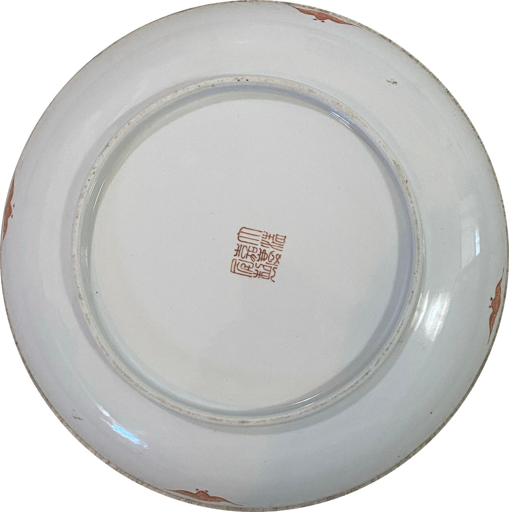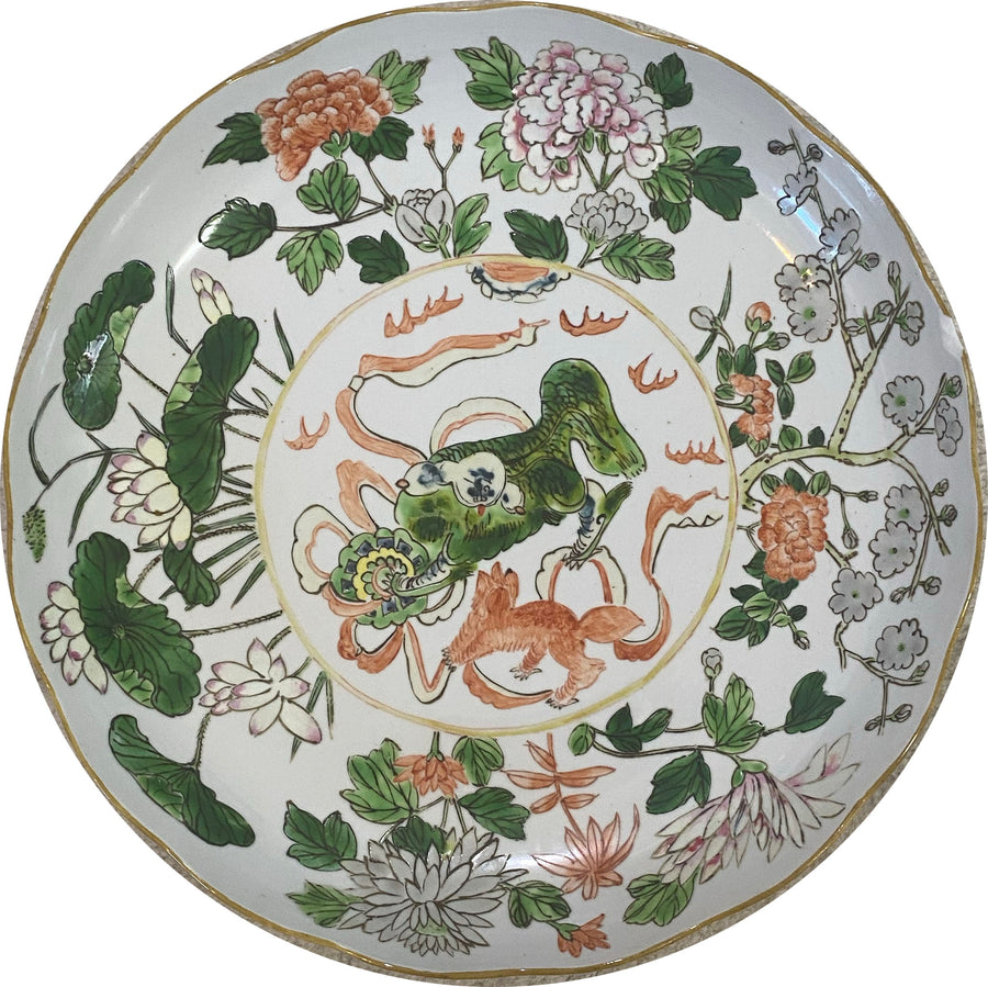 This exquisite hand-painted porcelain plate features a vibrant central depiction of a green foo dog surrounded by fluttering ribbons, all encircled by lush floral and lotus motifs in shades of coral, green, and soft lilac. Delicate gilded detailing adds refinement to the scalloped edge. The back is marked with an Asian red seal stamp, indicative of traditional craftsmanship.