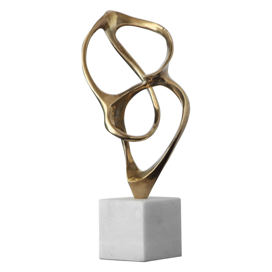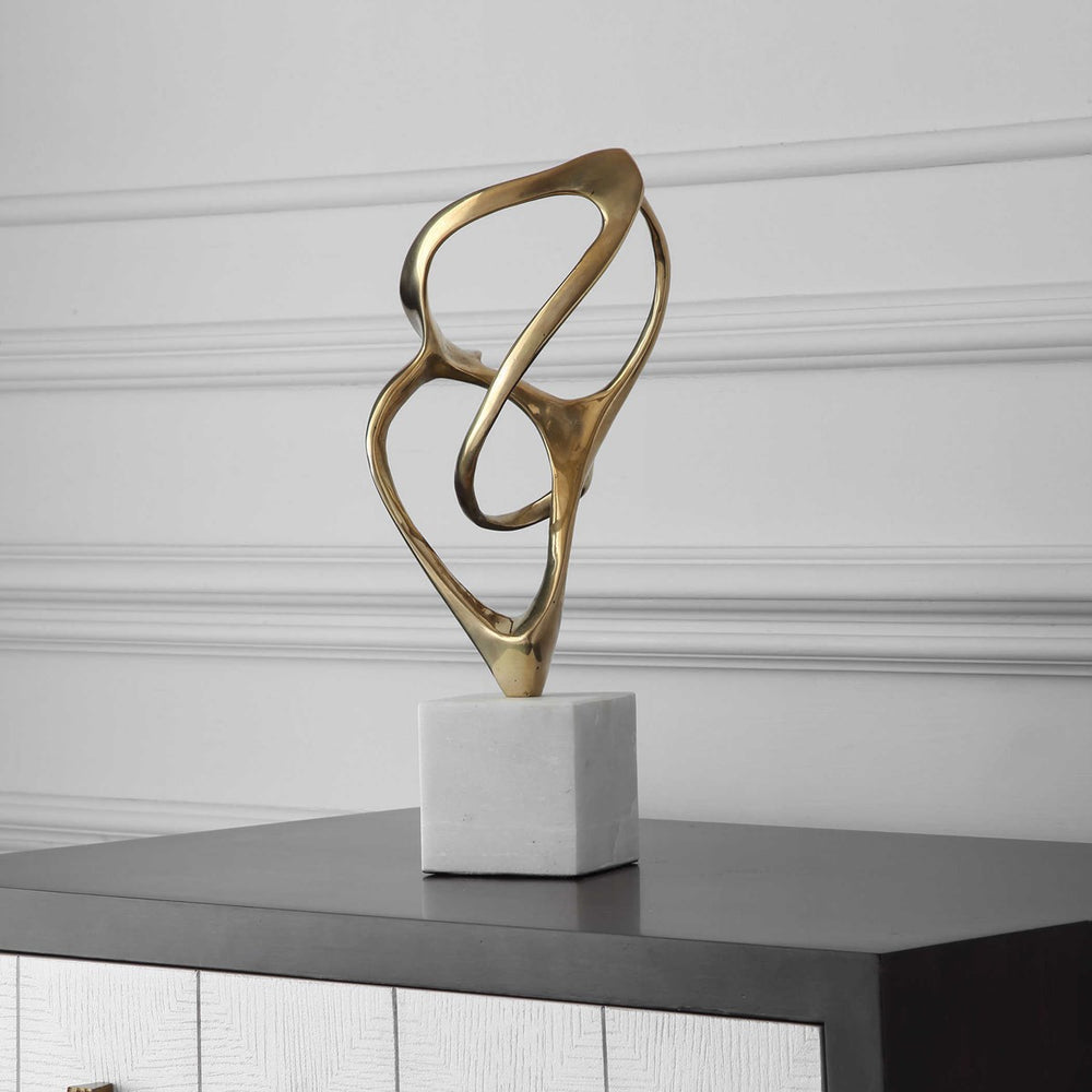 Graceful ropes of solid brass loop and cross to make this gorgeous sculpture. Mounted on a honed white marble base, the light lines of natural brass seems to float in mid-air.