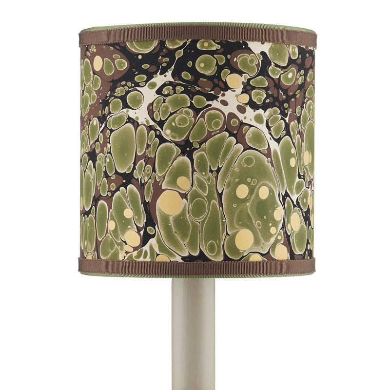 Petite shades are an easy way to bring added style to a space while also introducing color and texture, particularly when they are made from artisanal marbleized paper and ornamented with two layers of grosgrain ribbon in different hues. The saturation of the colors on the handmade tapered and cylindrical shades for chandeliers and wall sconces is achieved by a New England atelier. Patterns will vary because they are created during a very organic process that makes any surface treated to marbleizing so special. There are both vivid and pastel patterns in this collection, as you can see from this green, brown, gold version of the drum shade.