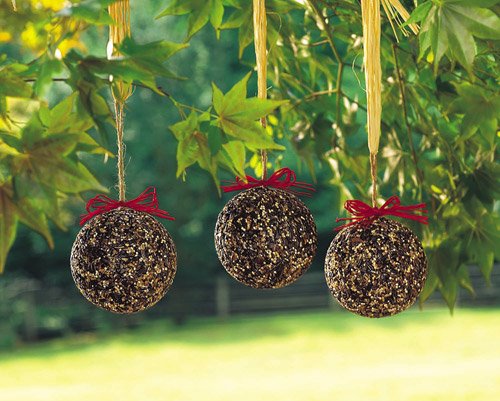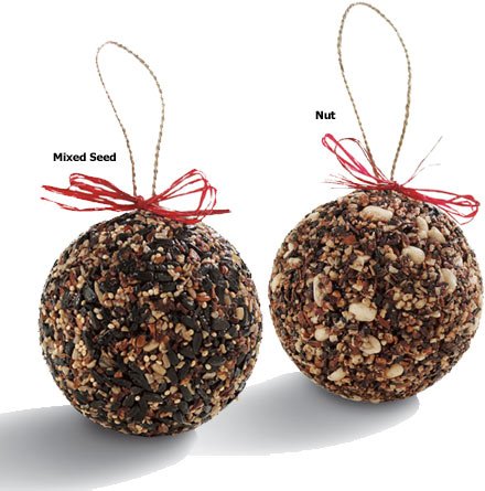 Darling 4″ diameter solid seed & nut edible ornaments with jute hanger and red raffia bow. The birds eat it all!