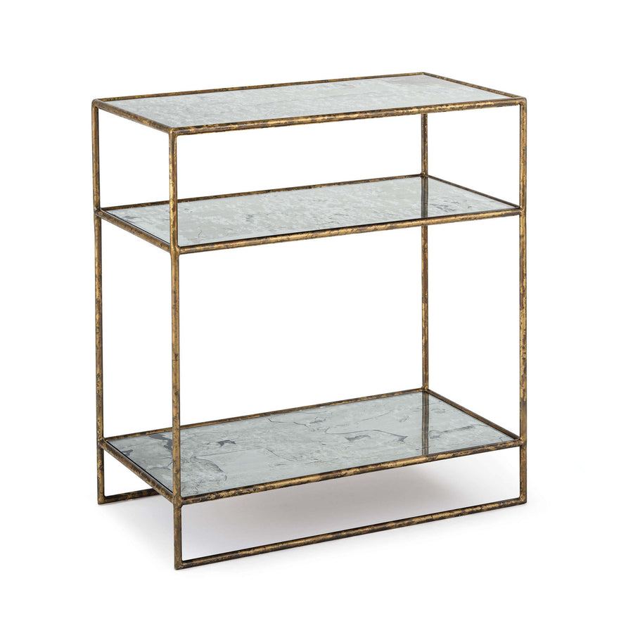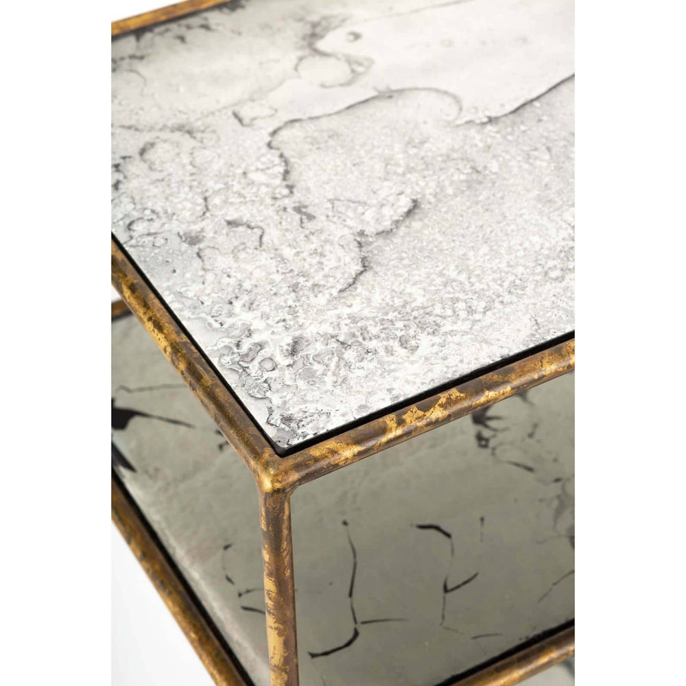 Crafted in Detroit, Michigan, this table is a classic piece of accent furniture with a subtle edgy appeal. Its delicate-looking gold steel frame suspends an antique mirrored table top that has a hand-applied patina, which gives the table its signature textural appearance.