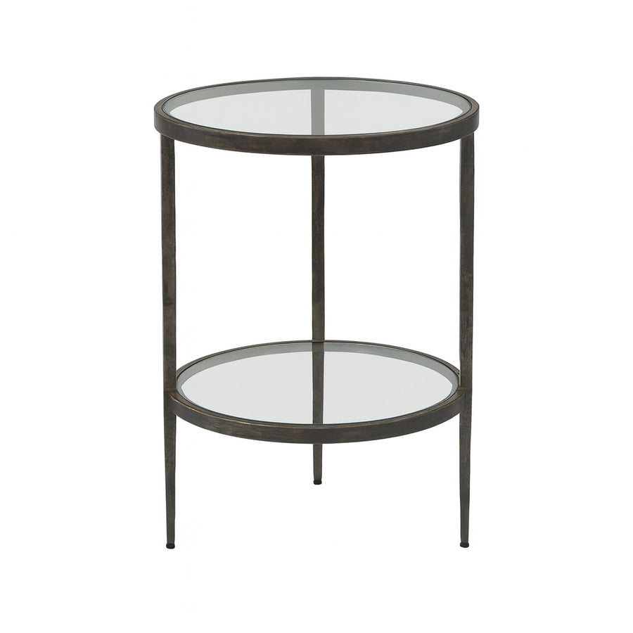 This two-tiered side table is beautiful simplicity come to life. Made from handsome and sturdy iron, this piece features a clear glass top and shelf. Natural Iron with Brazed Brass Details.
