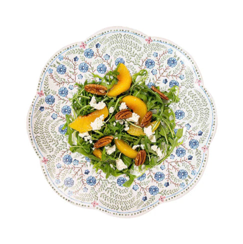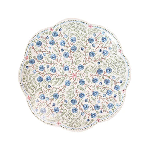 Festooned with a burst of intricate leaves, charming blue flowers and a scalloped rim with tiny dots and pink blossoms, this enchanting plate makes serving up salads and sweets a delicious work of art.
