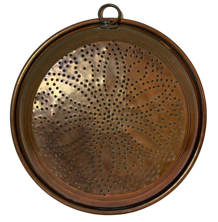 A beautiful example of functional craftsmanship, this vintage copper strainer features an intricate starburst pattern of hand-pierced holes, adding both utility and charm. Made from solid copper with a rolled edge and a hanging loop for easy display, it’s as decorative as it is practical.